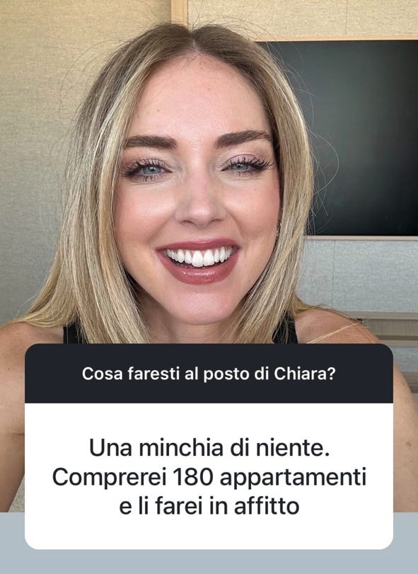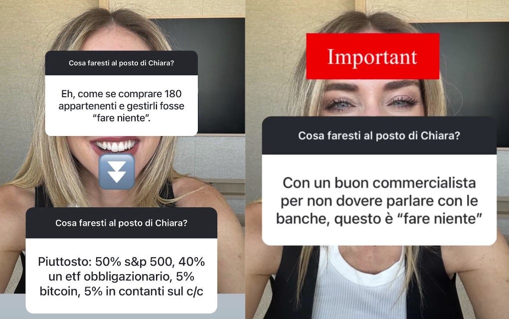 Prendendo sul serio l’idea, molto italiana, di investire nel mattone, come fa notare un lettore, le cose sono meno semplici del previsto. Gestire decine, o centinaia, di appartamenti potrebbe essere un lavoro molto più oneroso di quello dell’influencer, anche se fatto attraverso una società dedicata.