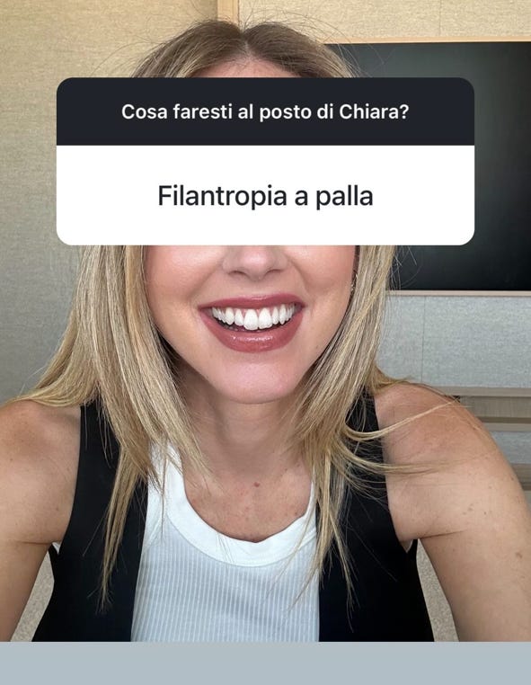 Chiara lo sta già facendo, ma non basta. Come riportato dal Corriere della Sera e Milano Finanza nel 2023 sono stati donati dalla sua società TBS Crew Srl 1,15 milioni a strutture ospedaliere ed enti che perseguono finalità civiche, solidaristiche e di utilità sociale.