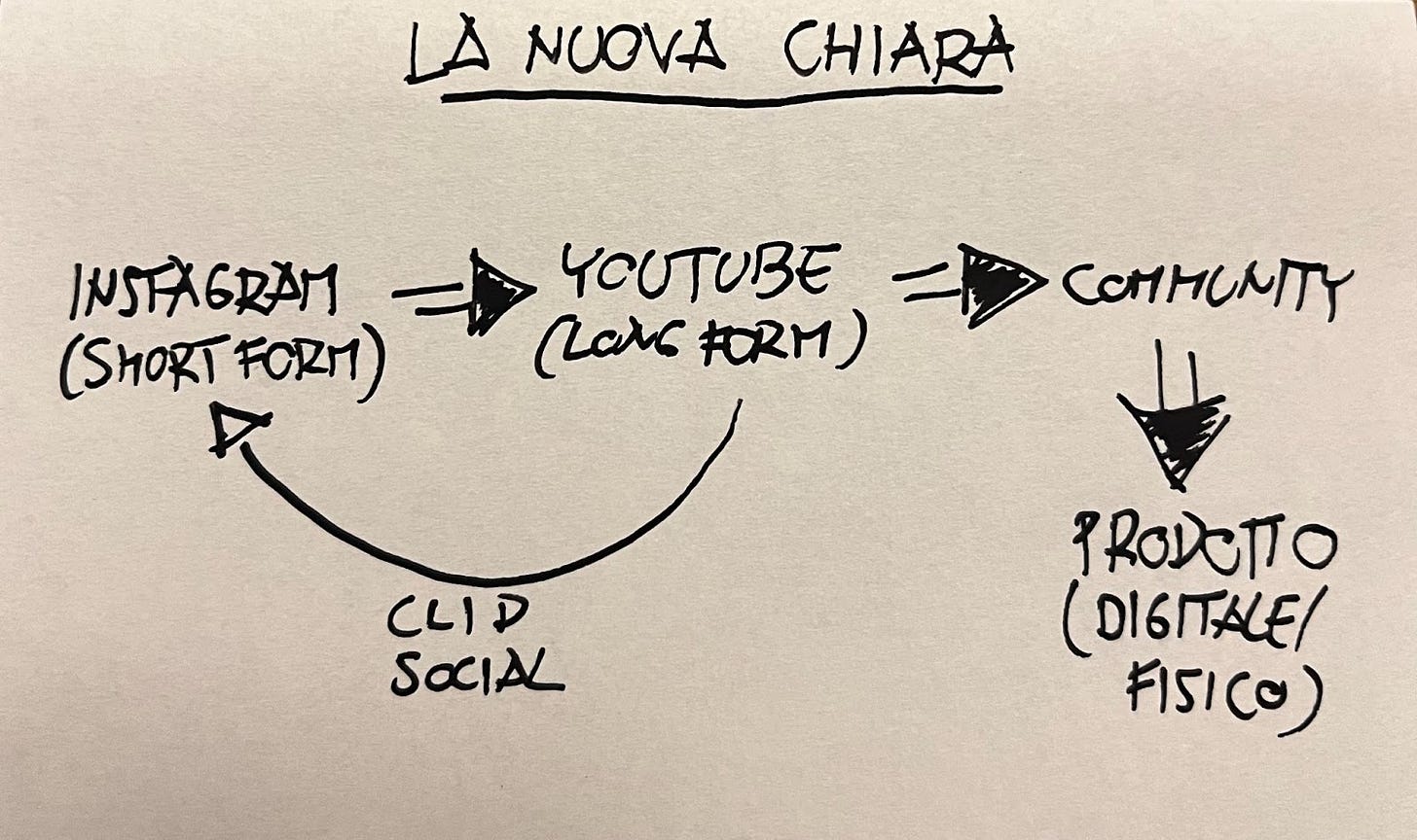 L’obiettivo è dimostrare che non si faranno più gli stessi errori e costruendo, contenuto dopo contenuto, una Chiara e un’azienda migliore e più forte. Così facendo si diversificherebbero i touchpoint, allargandosi a temi come la finanza, il coaching e altro ancora.